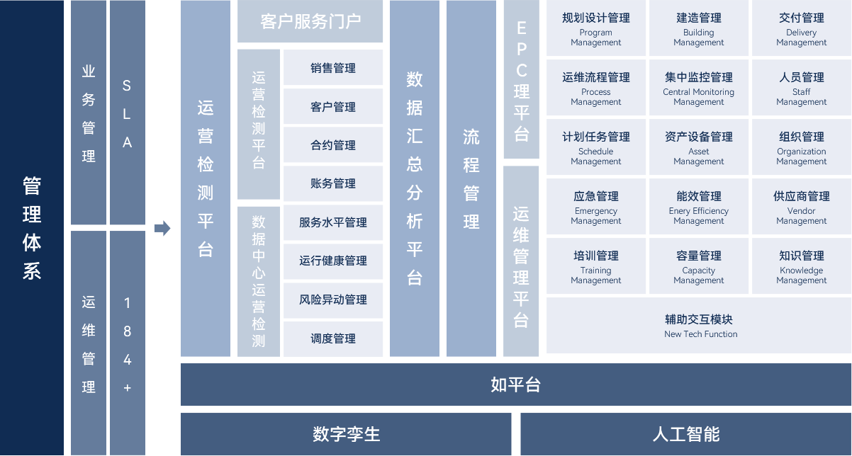 德衡數據自研的DC-Mind數據中心一體化運營管理平臺,覆蓋了現有的關鍵管理域。基于DC-Mind生態產品的IoT技術實現了數據中心設備組件級采集監控和遠程控制,在實現節能控制、資源管理、機房綜合管理、IT運維管理、智能分析的基礎上,平臺加入了Al組件和數字孿生引擎的支持,進一步推動平臺實現面向多數據中心的智控/數字孿生的統一調度管理。從規劃設計到機柜交付再到資源銷售結算,德衡數據提供整套面向覆蓋IDC全業務生命周期的智能化運營方案和服務。